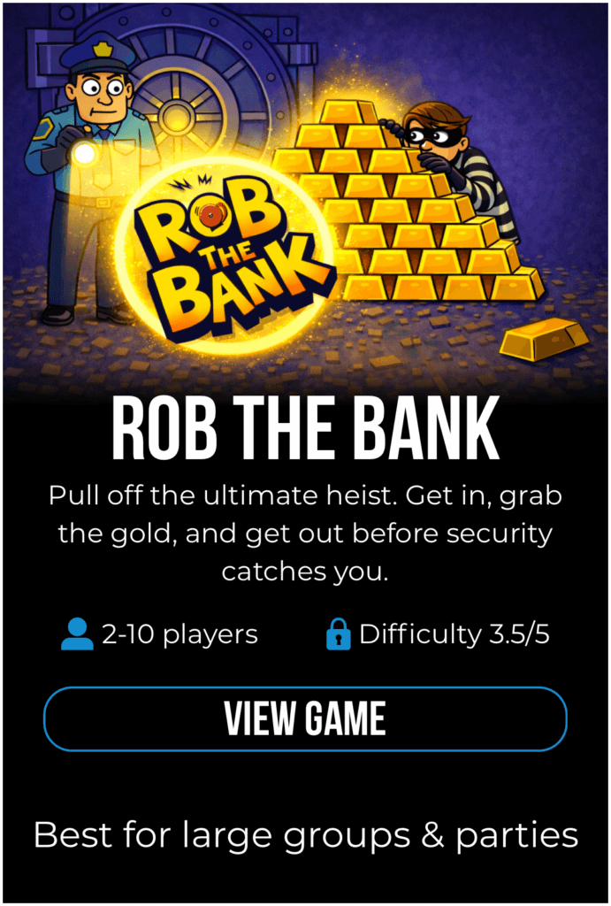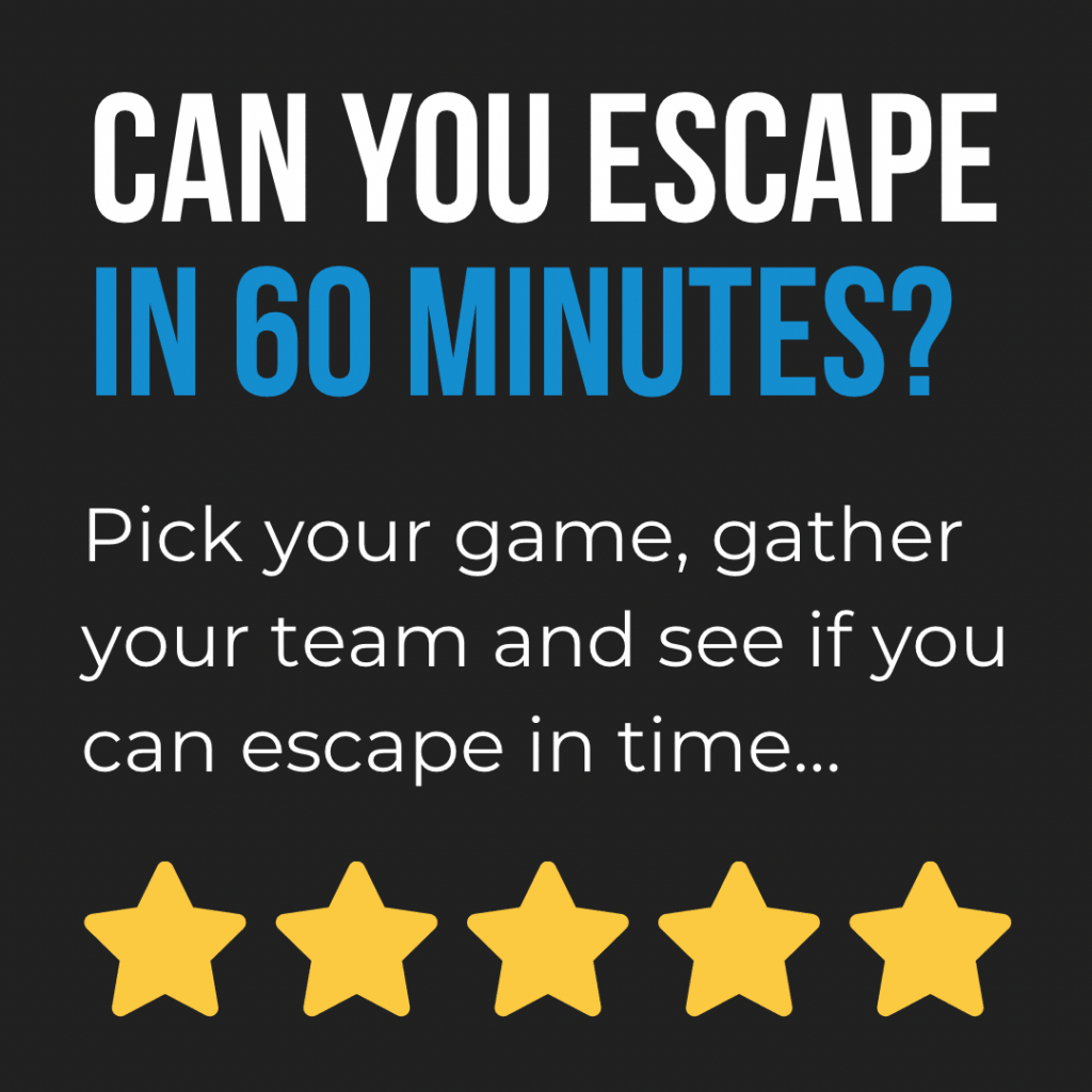 You’ll have 60 minutes to solve a series of puzzles and escape the room! Each experience is uniquely themed to create a fully immersive adventure. You and your team will need to work together, uncover hidden clues, and crack the challenges to achieve your goal before time runs out.