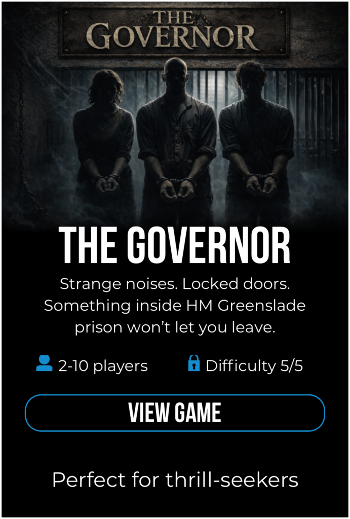 We have five different games here, all with different themes. Most of them aren’t scary but if you choose our horror game, The Governor, you can expect a dark, spooky atmosphere and plenty of jump scares, but no live actors.
